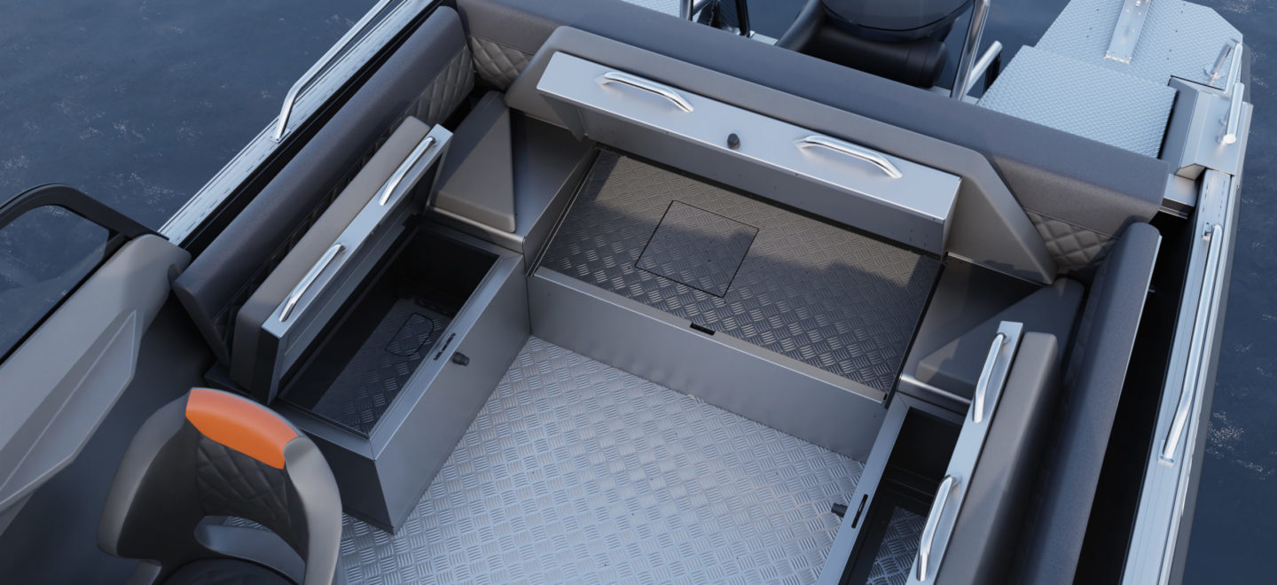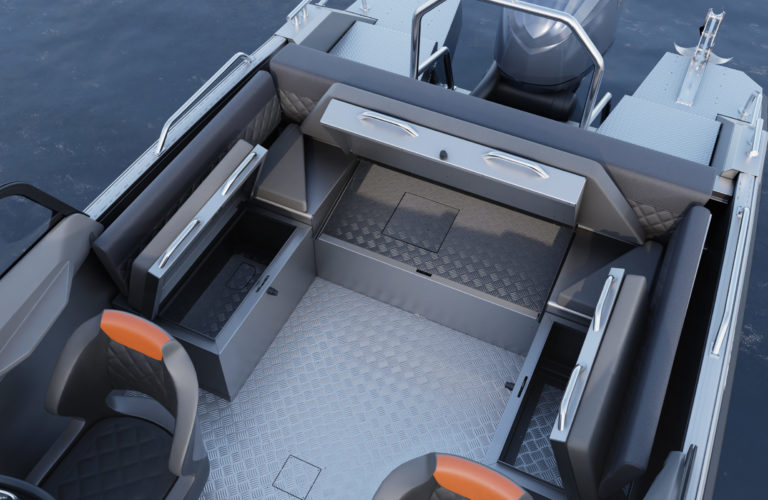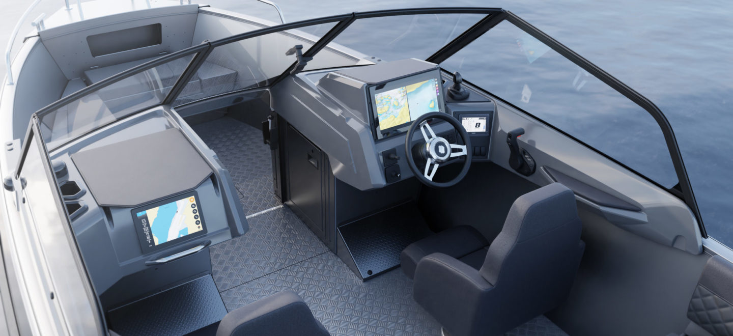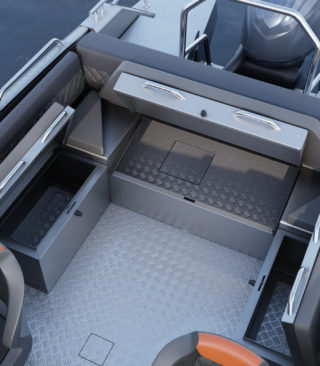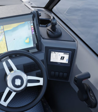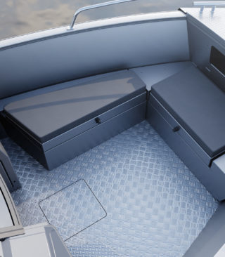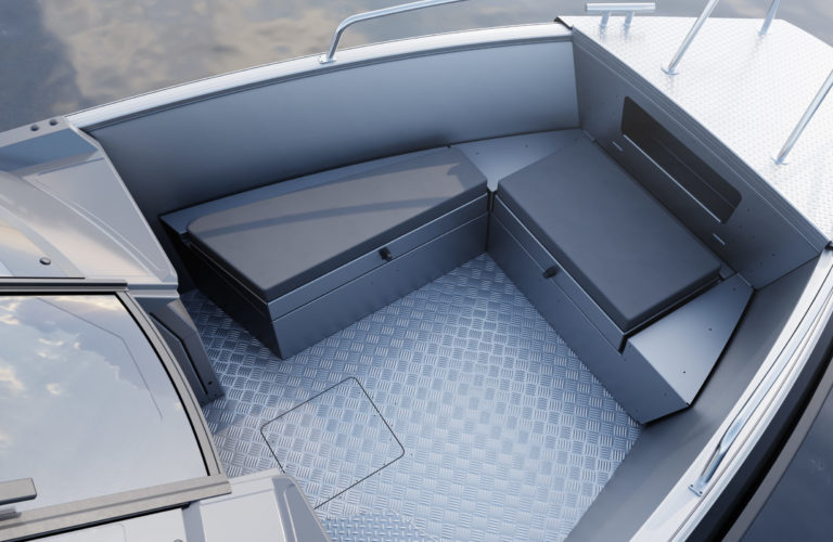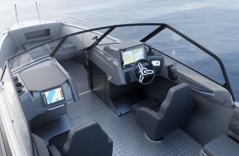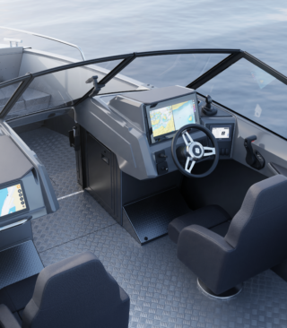 Standardutstyr inkluderer tiltratt og trimplan med joystickkontroll, lanterner og nøkkelfri tenning. Gulvet er i sklisikkert mønstret aluminium, mens rekkverk, knapper og andre dekkbeslag er i rustfritt stål. U-formet aktersofa er også standard.