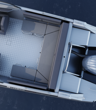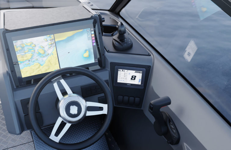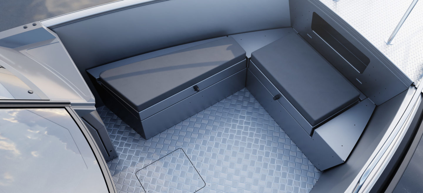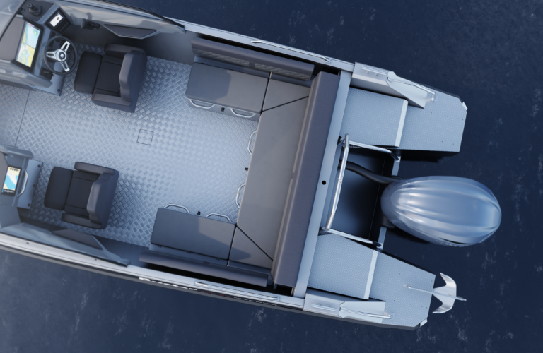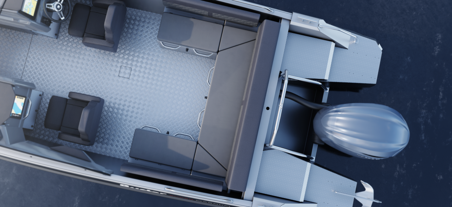 Standardutstyr inkluderer tiltratt og trimplan med joystickkontroll, lanterner og nøkkelfri tenning. Gulvet er i sklisikkert mønstret aluminium, mens rekkverk, knapper og andre dekkbeslag er i rustfritt stål. U-formet aktersofa er også standard.